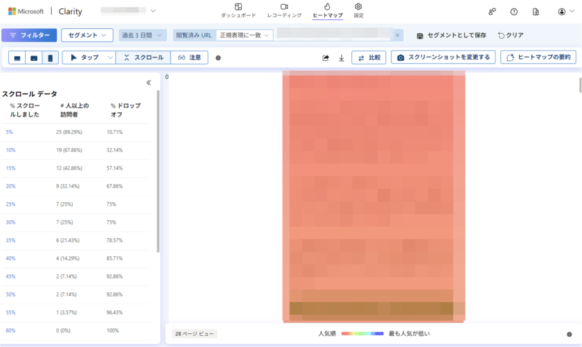 訪問者の流入元などはもちろん、「ヒートマップ」と呼ばれる、「ページのどの部分がよく見られているか」「どこで離脱しているのか」「どの位置でクリックされているのか」などを、サーモグラフィーを使って見ることができます。