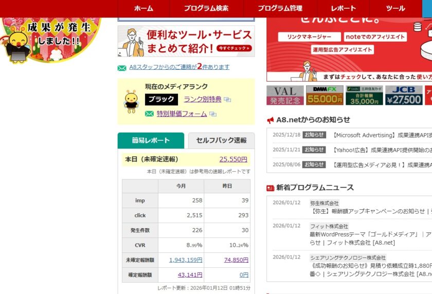 - 高単価案件の選定:1件100円の案件ではなく、数千円〜数万円の成果報酬があるジャンルを主戦場にしている。